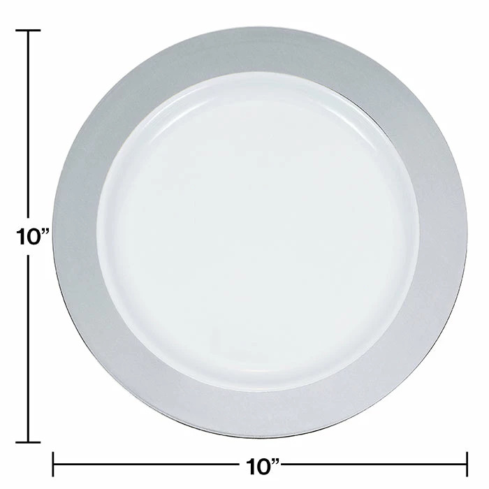 Details: Add a little sparkle to your party when you use the Silver Rim Plastic Plates. These sturdy plastic plates measure 10″ and feature a clear and silver theme. These disposable plastic plates coordinate with all Silver party supplies. Our Silver Rim Plastic Banquet Plates are perfect for event planners, caterers, and home hostesses alike.