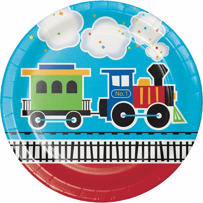 Details: Celebrate your young conductor’s special day with our All Aboard Train Lunch Plates! These sturdy paper plates are printed with cartoonish trains and a light blue and red background. These party plates are perfect for your little speedster! With discount pricing, our All Aboard Train Dinner Plates are perfect for event planners, caterers, and home hostesses alike. For this price, you get one package containing (8) All Aboard Train Paper Plates. Approximate Dimensions: 8.75 in x 8.75 in