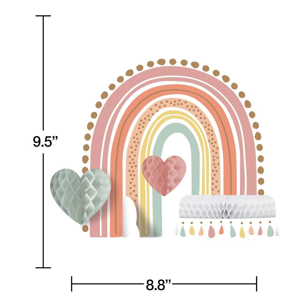 Details: Transform your party table into an on-trend bohemian masterpiece with the Boho Rainbow Centerpieces. Measuring 9.5″ x 3 these centerpieces feature an adorable rainbow with subtle touches of metallic copper, honeycomb hearts, clouds, and colorful tassels. Sold in packs of 1, this honeycomb centerpiece can be paired with any other Boho Rainbow party supplies. Place one centerpiece on every table at your child’s birthday party, or draw everyone’s attention to the dessert table at a baby shower. Our Boho Rainbow Centerpieces are perfect for event planners, caterers, and home hostesses alike.