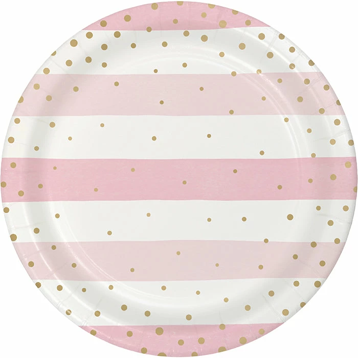 Details: Your guests will marvel at your litttle one’s birthday party when you use the Pink and Gold Celebration Paper Plates. These sturdy paper plates measure 9″ and feature a pink, white, and gold theme. These disposable paper plates coordinate with all Pink and Gold Celebration party supplies. Our Pink and Gold Celebration Dinner Plates are perfect for event planners, caterers, and home hostesses alike.