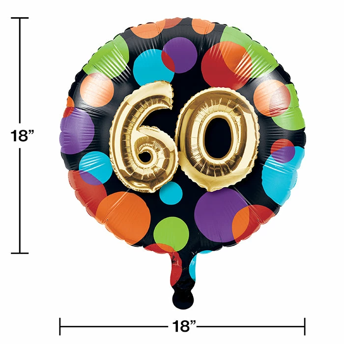 Tie the Balloon 60th Birthday Mylar Balloon to a chair or your table to add to your decorations. This foil party balloon measures 18″ when inflated and features multi colored dots on a black background and a large number 60 made out of balloons in the center. This metallic balloon can be combined with any of our other Balloon 60th Birthday party supplies. With wholesale pricing and bulk quantities, our Balloons 60th Birthday Mylar Balloons 10 ct are perfect for event planners, caterers, and home hostesses alike.