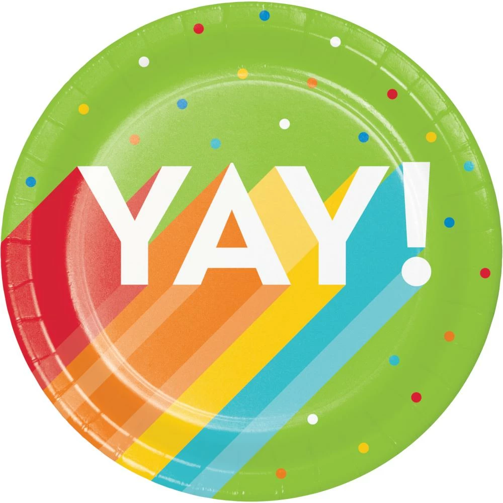Details: Bring excitement to the party when you serve a piece of chocolate cake on the Happy Birthday Bash Dessert Plates. These sturdy paper plates measure 7″ and feature the words “YAY!” in bold letters with a green, blue, yellow, orange, and red theme. Sold in packs of 8, these disposable paper plates coordinate with all Happy Birthday Bash party supplies. Save more on party decorations, party favors and party supplies at PartyDecorations.com!. Material: Paper Boardstock. Approximate Size/Dimensions (inches): 6.875 x 6.875.