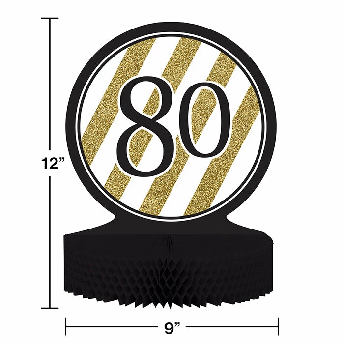 Details: Make a big statement at the milestone birthday celebration with the Black & Gold 80th Birthday Centerpiece. This table decoration features a large cutout that displays an elegant “80” along with a gold and white striped background that sits atop a black honeycomb base. The centerpiece coordinates tremendously with other 80th birthday theme party supplies and decoration. With discount pricing, our Black and Gold 80th Birthday Centerpieces are perfect for event planners, caterers, and home hostesses alike. You get one Black And Gold 80th Birthday Centerpiece for this price. Approximate Dimensions: 9 in x 12 in