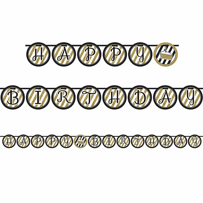 Details: Make a big statement at the birthday party with the Black & Gold Ribbon Banner. This festive hanging decoration includes 6″ circles strung together to spell out “Happy Birthday”. The 10′ party decoration can be hung from entryways, walls, along the edge of a table, or diagonally across your front door to welcome guests. With discount pricing, our Black and Gold Ribbon Banners are perfect for event planners, caterers, and home hostesses alike. You get one Black And Gold Ribbon Banner for this price. Approximate Dimensions: 121 in x 6 in