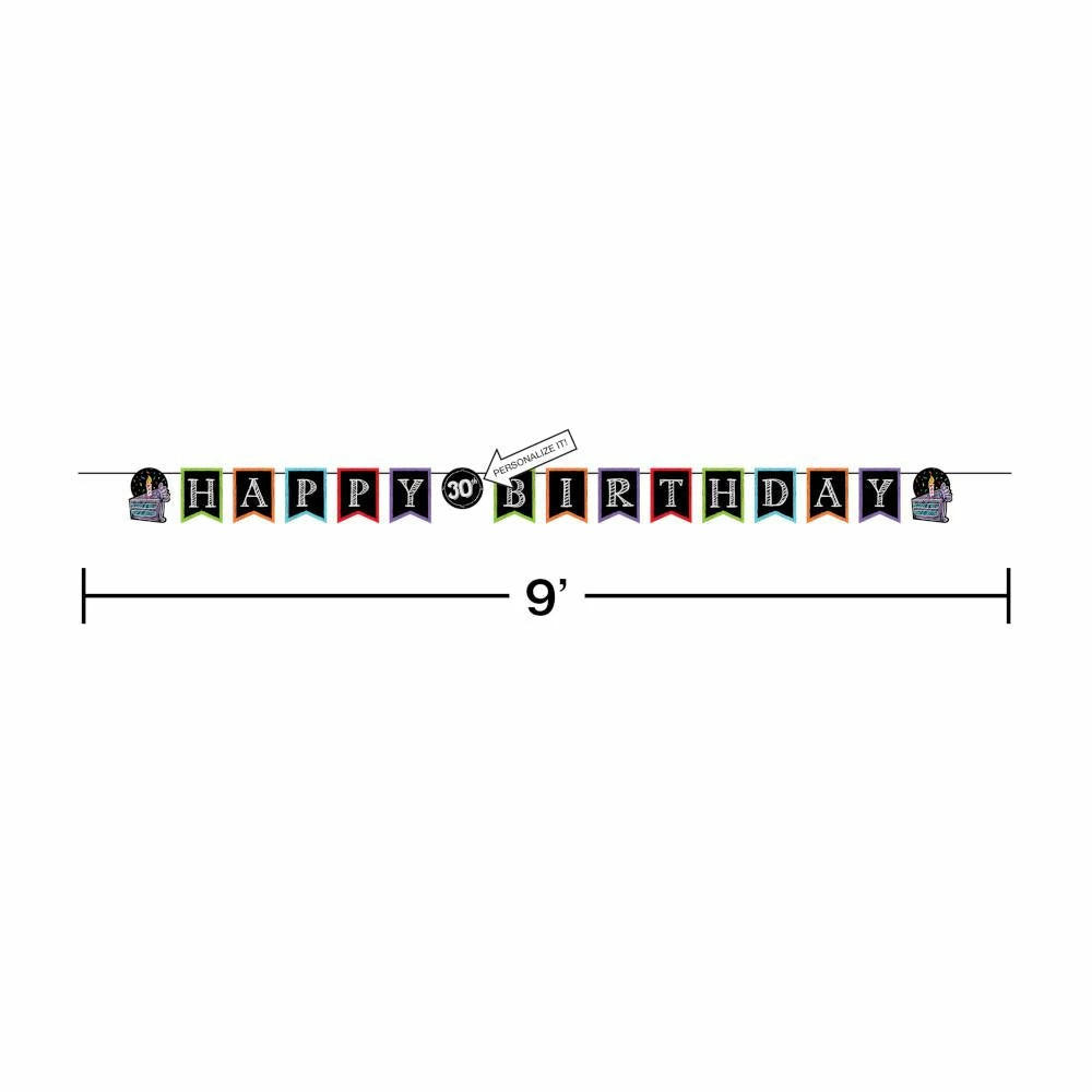 Easily liven up the venue for birthday celebrations of all ages with our wholesale Chalk Banners featuring colorful chalk-drawn details atop a vibrant black background. The bulk letter banners are made up of individual pennant flags that are strewn from a piece of twine to spell out a ”appy Birthday” message. A circular cardstock cutout which can be personalized with the guest of honor’s age is also included with each Chalk party banner.