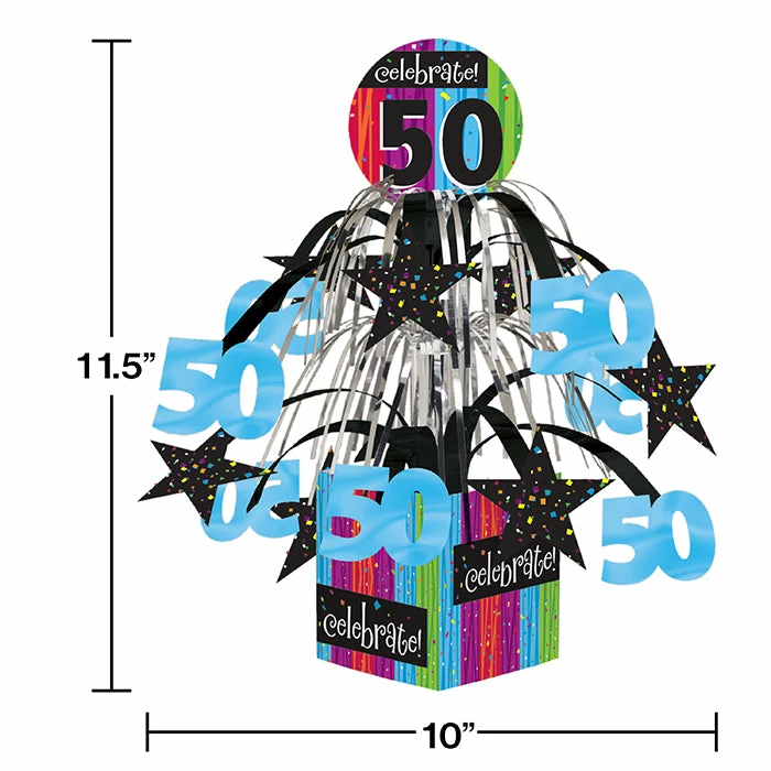 Details: Celebrate in style with the vibrant 50th Birthday Milestone Celebrations Centerpiece. This table decoration features a square base and bright blue 50’s and stars cutouts that shoot from silver and black foil strands. With discount pricing, our Milestone Celebrations 50th Birthday Centerpieces are perfect for event planners, caterers, and home hostesses alike. You get one Milestone Celebrations Centerpiece Cascade W/Base & Att, ’50 for this price. Approximate Dimensions: 11 in x 11 in x 11.5 in
