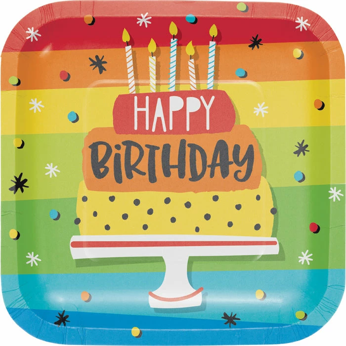 Details: Make sure everyone gets their cake and eats it too with these Rainbow Cake Square Dessert Plates. The deep-dish plates are made of paper and measure 7″ square perfect for all of your snacks and goodies. Each one features a rainbow background and a giant birthday cake that says “Happy Birthday” on it. These plates can be combined with other Rainbow Cake party supplies. With discount pricing and great quality our Rainbow Cake Square Dessert Plates are perfect for event planners caterers and home hostesses alike. Approximate Size: 7″. Material: Heavyweight Paperboard