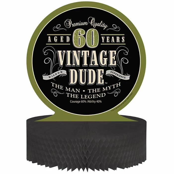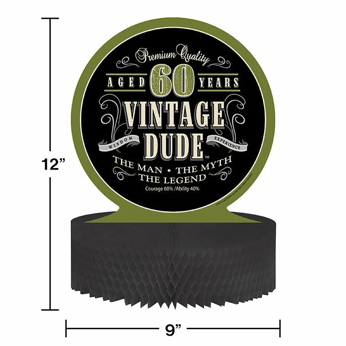 Details: Stock up on 60th birthday decorations starting with our Vintage Dude Honeycomb Centerpiece “60” 6 ct. These centerpieces will bring any party table to life. The centerpieces coordinate seamlessly with our Vintage Dude wholesale party supplies collection. Offer shoppers a wide variety of 60th birthday party supplies this season. You get one Vintage Dude 60th Birthday Centerpiece for this price. Approximate Dimensions: 8.75 in x 8.75 in x 11.75 in