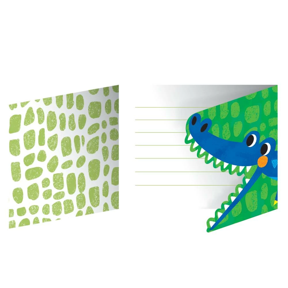 Details: Invite everyone over for your child’s alligator-themed birthday party with help from our Alligator Birthday Party Invitations. These invitations measure 5.75″ x 4.5″, and they include envelopes for mailing. They feature a green reptile skin look with a friendly blue alligator, and “you’re invited” text. Simply fill out your party details and send to guests! These invitations are a part of our Alligator Birthday Party collection, which includes all the party supplies you need for your celebration. Our Alligator Birthday Party Invitations are sold eight invitations per package. Save more on party decorations, party favors and party supplies at PartyDecorations.com!. Material: Paper. Approximate Size/Dimensions (inches): 4.5 x 5.75.