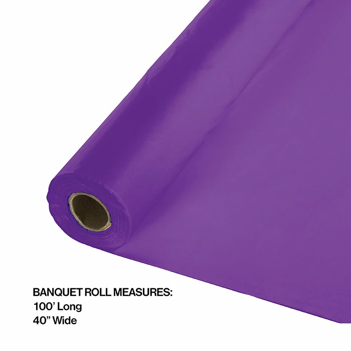 Details: Set the stage for an impressive look with our Amethyst Purple Plastic Banquet Table Roll. The wholesale plastic table cover roll is a cost-effective way to include vibrant shade of color, quality and convenience to any dining atmosphere. Perfect for holiday parties, social gatherings, catered events or any large event, each plastic table cover roll measures 40 inches by 100 feet and can be easily customized to the desired length and cut to the size. The disposable table rolls are water repellent, providing an eye-catching eating surface which is easy to wipe clean. The disposable table roll can be conveniently recycled. You get one Amethyst Banquet Roll 40″ X 100′ for this price. Approximate Dimensions: 100 ft x 40 in