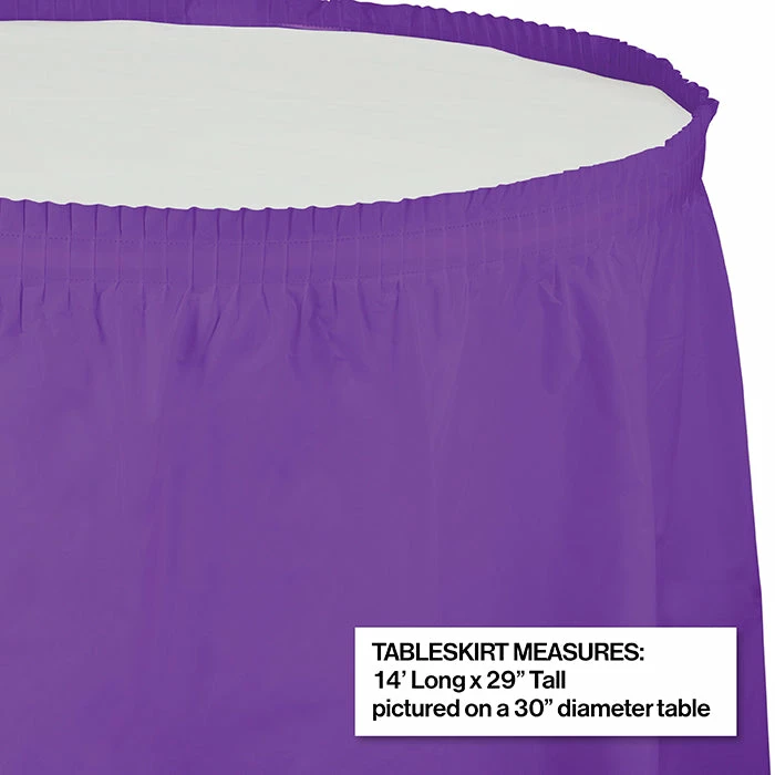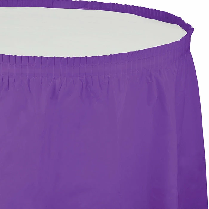 Details: This Amethyst Purple Plastic Tableskirt will provide an eye-catching setting at your upcoming event. Use these tasteful tableskirts to dress up your table. This beautiful table decoration can be ready in no time at all and is perfect for graduations, banquets, and weddings. With discount pricing, our Amethyst Purple Plastic Tableskirt are perfect for event planners, caterers, and home hostesses alike. You get one Amethyst Plastic Tableskirt, 14′ X 29″ for this price. Approximate Dimensions: 168 in x 29 in
