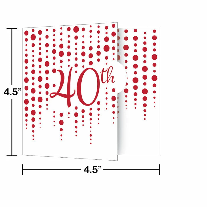 Invite your family and friends to a landmark occasion when you use the Ruby 40th Anniversary Invitations. These paper invitations measure 6″ x 4″ and feature a white and ruby theme with ruby circles and a printed “???40th”. These paper invitations coordinate with all Ruby 40th Anniversary party supplies. With wholesale pricing and bulk quantities our Ruby 40th Anniversary Invitations 48 ct are perfect for event planners caterers and home hostesses alike.. Size: 6″ x 4″. Material: Paper