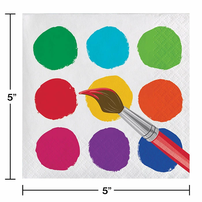 Details: Prepare your next celebration with the Art Party Beverage Napkins. Create a lasting image with these paper napkins which feature splashes of color and a palette of vivid colors and a paintbrush. Perfect to serve with sodas, cocktails, or any beverage, the Art Party Beverage Napkins are a must-have when using our other Art Party supplies! With discount pricing, our Art Party Beverage Napkins are perfect for event planners, caterers, and home hostesses alike. For this price, you get one package containing (16) Art Party Beverage Napkins. Approximate Dimensions: 5 in x 5 in