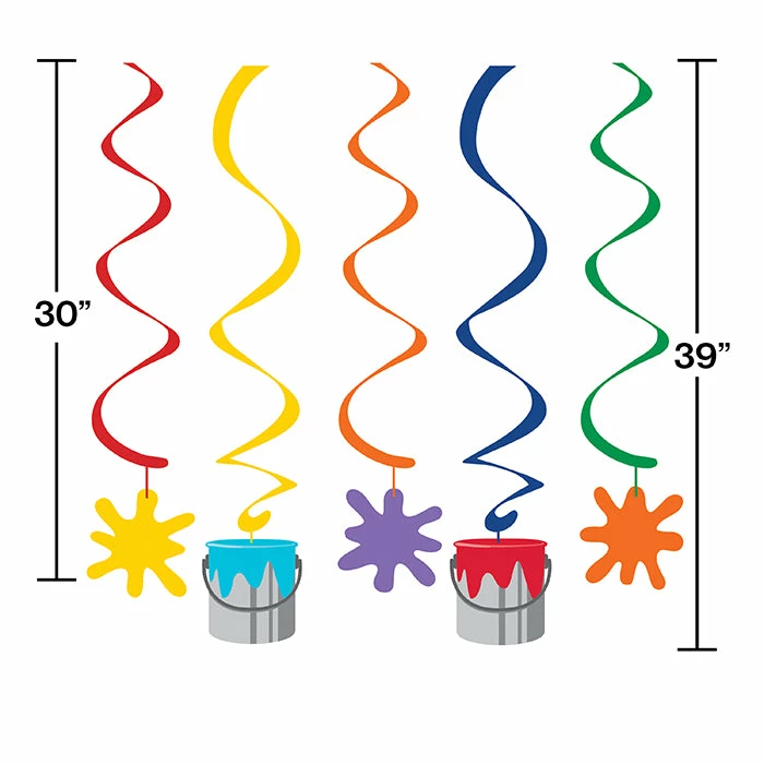 Details: Make the birthday celebration a hit with the Art Party Dizzy Danglers. Celebrate your little one’s big day by decorating your home with these assorted hanging decorations that feature paint can cutouts on colorful spirals. These decorations coordinate well with other Art Party theme supplies and accessories. With discount pricing, our Art Party Dizzy Danglers are perfect for event planners, caterers, and home hostesses alike. For this price, you get one package containing (5) Art Party Dizzy Danglers. Approximate Dimensions: 39 in