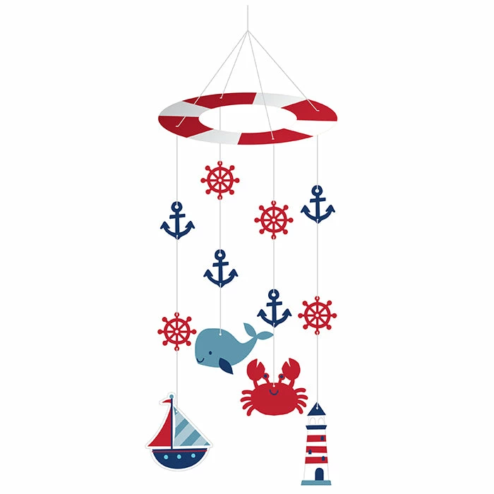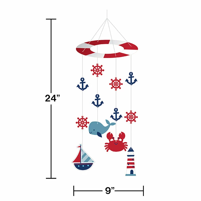 The Nautical Baby Shower Hanging Mobile will delight the expecting mother. These hanging paper mobiles measure 24″ x 9″ and feature cutouts of whales, lighthouses and anchors with a blue, white, and red theme. Sold in packs of 6, these paper mobiles coordinate with all Nautical Baby Shower party supplies. With wholesale pricing and bulk quantities, our Nautical Baby Shower Hanging Mobiles 6 ct are perfect for event planners, caterers, and home hostesses alike.
