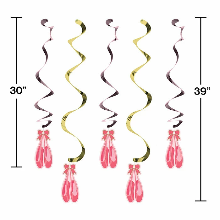 Details: Add some shine with your party decorations at your little girl’s birthday party with the Ballet Assorted Danglers. The hanging decoration includes gold and pink foil spirals with pointe shoe attachments hanging from the bottom. Thees dizzy danglers can be matched with other Ballet party supplies. With discount pricing, our Ballet Assorted Danglers are perfect for event planners, caterers, and home hostesses alike. For this price, you get one package containing (5) Ballet Assorted Danglers. Approximate Dimensions: 39 in