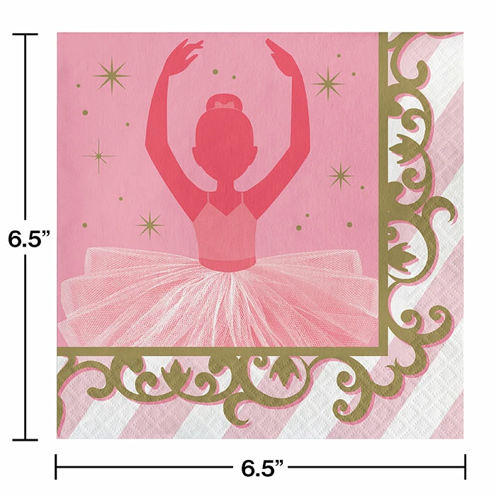 Details: Stack the Ballet Napkins at the party table by the birthday cake and let the little ballerinas dig in! The 6.5″ napkins feature facial quality tissue and display a graceful ballerina with sparkling gold stars in the background. These luncheon napkins will make an excellent addition to your little girls’ birthday party. With discount pricing, our Ballet Luncheon Napkins are perfect for event planners, caterers, and home hostesses alike. For this price, you get one package containing (16) Ballet Napkins. Approximate Dimensions: 6.4 in x 6.4 in