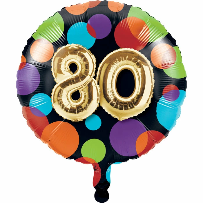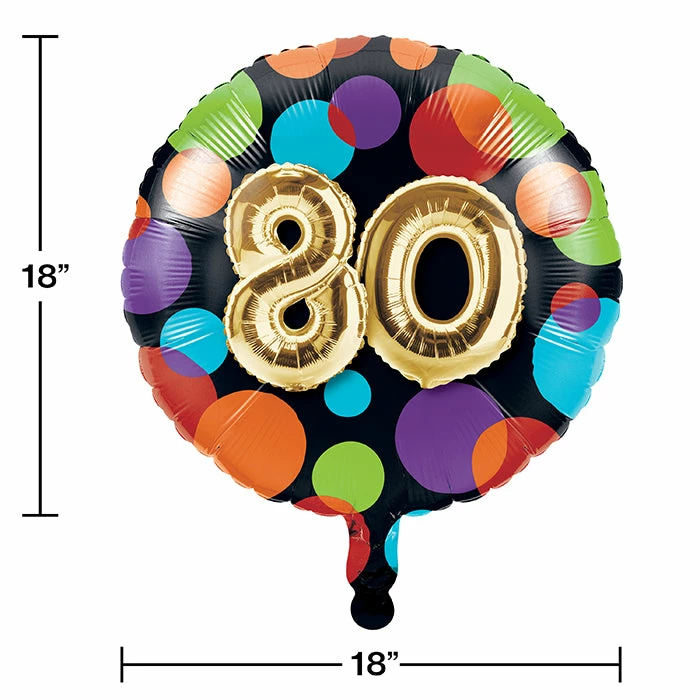 Proudly display the number of years you’re celebrating with the Balloon 80th Birthday Mylar Balloon. Measuring 18″ when inflated, this foil party balloon features multi colored dots on a black background and a large number 80 made out of balloons in the center. This metallic balloon can be combined with any of our other Balloon 80th Birthday party supplies. With wholesale pricing and bulk quantities, our Balloons 80th Birthday Mylar Balloons 10 ct are perfect for event planners, caterers, and home hostesses alike.