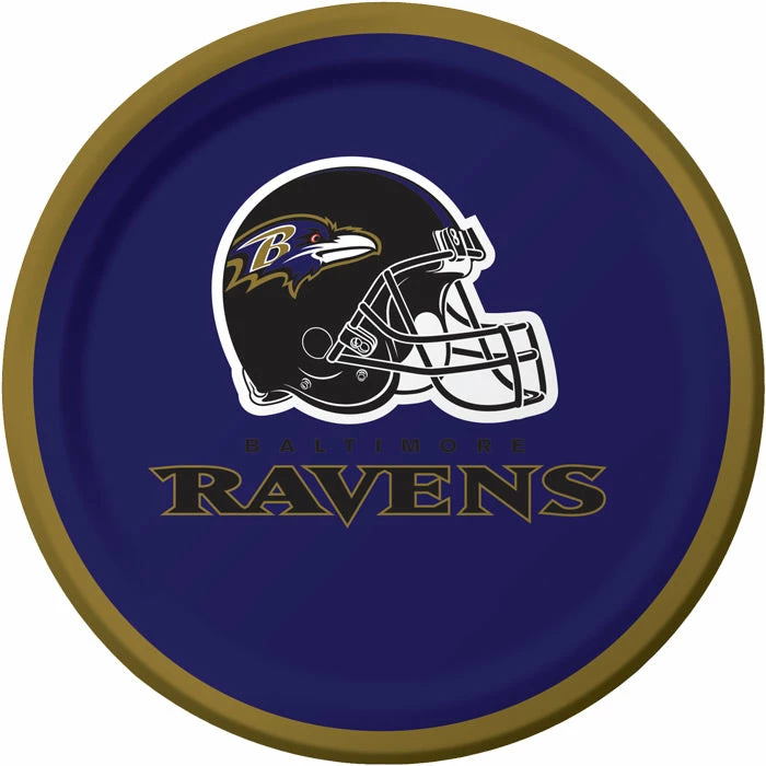 Details: Host an event as epic as the Battle of the Beltway and feed your football fanatics on appropriate tableware! The Baltimore Ravens Dessert Plates are designed to celebrate the team’s recognizable colors and logo for the perfect touch to any tailgating party game day celebration retail stores shelves or even sports bars. The officially licensed purple plates are constructed of sturdy heavyweight paperboard stock printed with an image of a black Ravens helmet in the center with the team name underneath. A gold border decorates the rim for a finishing touch. Serve appetizers finger foods side dishes and desserts off of these handy offerings for a fun fan experience. The paper plates measure 6.875″ in diameter and are packaged in quantities of 8. Approximate Size: 6.875″. Material: Heavyweight Paperboard