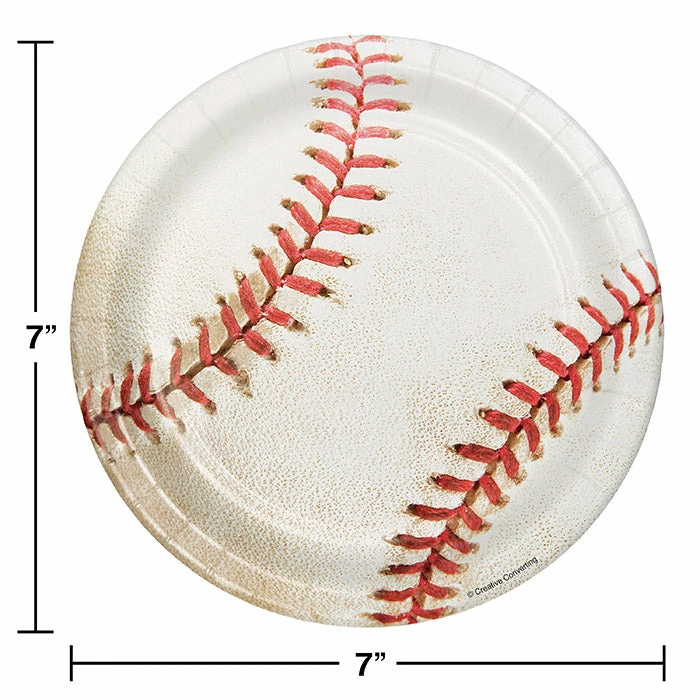 Details: You can’t play baseball in the house but you can eat off of one with these Baseball Dessert Plates. The Sturdy Style paper plates measure 7″ round and feature a picture of a baseball, covering the entire plate. The premium strength paper plate can be combined with other Baseball party supplies. With discount pricing, our Baseball Dessert Plates are perfect for event planners, caterers, and home hostesses alike. For this price, you get one package containing (8) Baseball Dessert Plates. Approximate Dimensions: 6.875 in x 6.875 in
