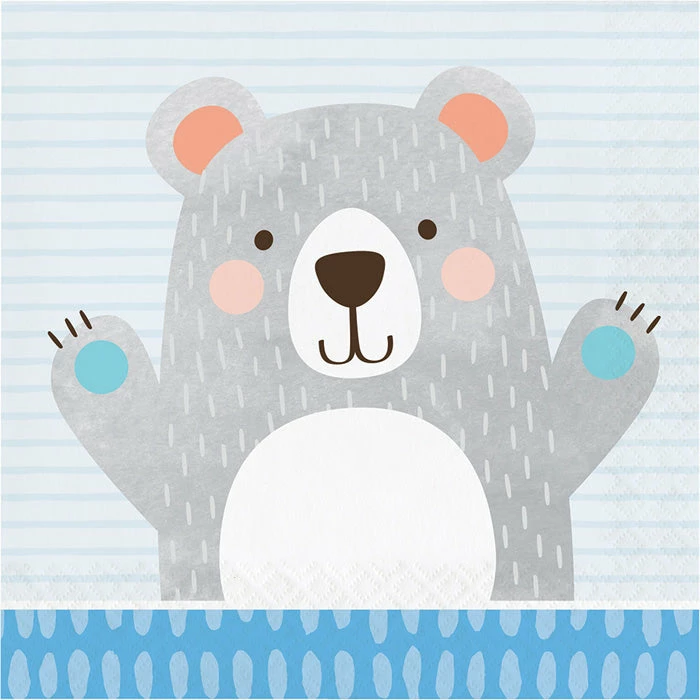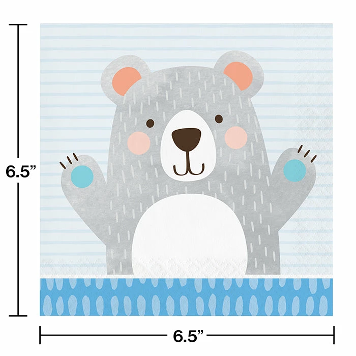 Details: Carry out the beary cute party theme with these Bear Party Napkins. These napkins measure 6.5″ and display a light blue, striped background and a darker blue bottom border that has lighter claw prints. In the center is a smiling gray bear with his hands in the air, ready to party with you. These disposable napkins can be coordinated with our other Bear Party party supplies. With discount pricing, our Bear Party Luncheon Napkins are perfect for event planners, caterers, and home hostesses alike. For this price, you get one package containing (16) Bear Party Napkins. Approximate Dimensions: 6.4 in x 6.4 in