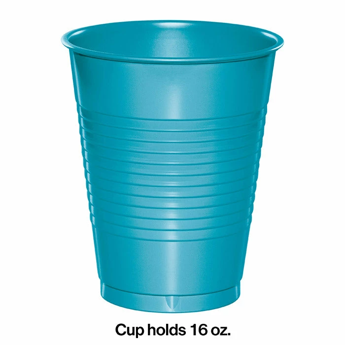 Details: The Bermuda Blue 16 oz Plastic Cups from our Touch of Color collection are manufactured in a heavy weight plastic to color match all the Bermuda Blue party supplies and feature a rolled rim edge at the top of an elegant tapered shape. Each stylish cup is perfect for serving up to 16 ounces of cold beverages at weddings, corporate functions and family gathering and makes an economical choice at an event that requires a disposable substitute for the real thing. The Bermuda Blue 16 oz Plastic Cups retail 20 cups per package. For this price, you get one package containing (20) Bermuda Blue Plastic Cups. Approximate Dimensions: 4.5 in