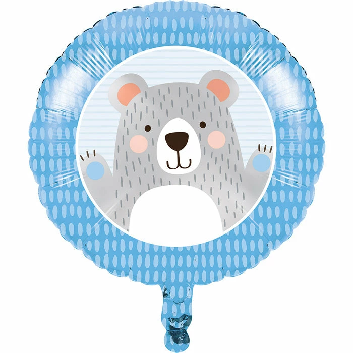 Details: Accessorize your party with the Bear Party Mylar Balloon. This foil party balloon measures 18″ when inflated and features a light blue, striped background surrounded by a darker blue border that has lighter claw prints. In the center is a smiling gray bear with his hands in the air, ready to party with you. This metallic balloon can be coordinated with any of our other Bear Party party supplies. With discount pricing, our Bear Party Mylar Balloons are perfect for event planners, caterers, and home hostesses alike. You get one Birthday Bear Metallic Balloon 18″ for this price. Approximate Dimensions: 18 in
