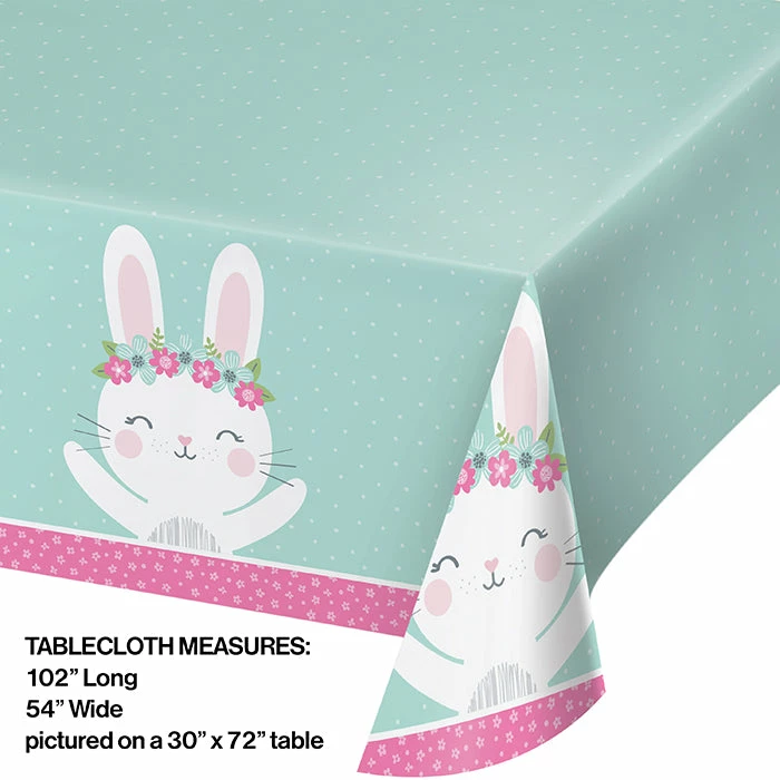 Details: Your party table will look gorgeous with the Bunny Party Plastic table cover. This table cover measures 102″ x 54″ and is made of plastic. It features a light blue top that is covered in white dots. This pattern extends to the sides and has a bottom border that is dark pink with white stars all over. The sides feature a pattern of large white bunnies with outstretched arms. The table cover can be mixed and matched with other Bunny Party party supplies. With discount pricing, our Bunny Party Plastic table covers are perfect for event planners, caterers, and home hostesses alike. You get one Birthday Bunny Plastic Tablecover All Over Print, 54″ X 102″ for this price. Approximate Dimensions: 102 in x 54 in