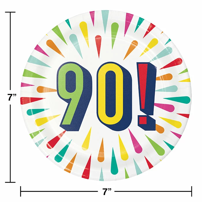 Details: Serve up dessert in color with these Birthday Burst 90 Dessert Plates. Featuring a colorful teardrop design with “90” centered in the middle, these plates are the perfect addition to your celebration. Measuring 7″ and These plates can be paired with any other Birthday Burst party supplies. Our Birthday Burst 90 Dessert Plates are perfect for event planners, caterers, and home hostesses alike.