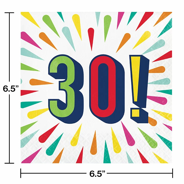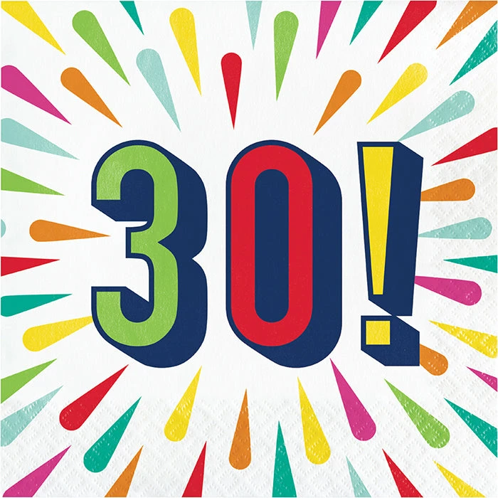 Details: Celebrate 30 in vibrant colors with these Birthday Burst 30 Napkins. Featuring a colorful bursting teardrop design with “30” centered in the middle, these napkins are the perfect addition to your party tables. Measuring 6.5″ these napkins can be paired with any other Birthday Burst party supplies. Our Birthday Burst 30 Luncheon Napkins are perfect for event planners, caterers, and home hostesses alike.