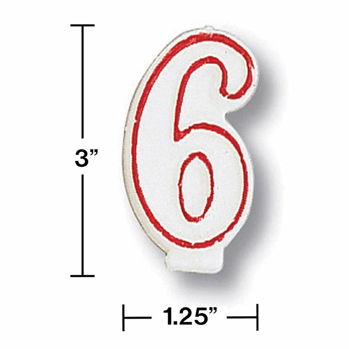 Details: Top off your birthday celebration with the #6 Candle! This cake decoration is shaped like the number six and allows you to create a customized birthday surprise. This product is decorated with a red outline and white center. With discount pricing, our #6 Candles are perfect for event planners, caterers, and home hostesses alike. You get one #6 Candle for this price. Approximate Dimensions: 1.875 in x 2.875 in