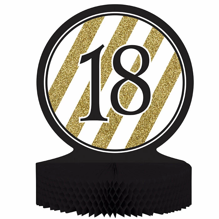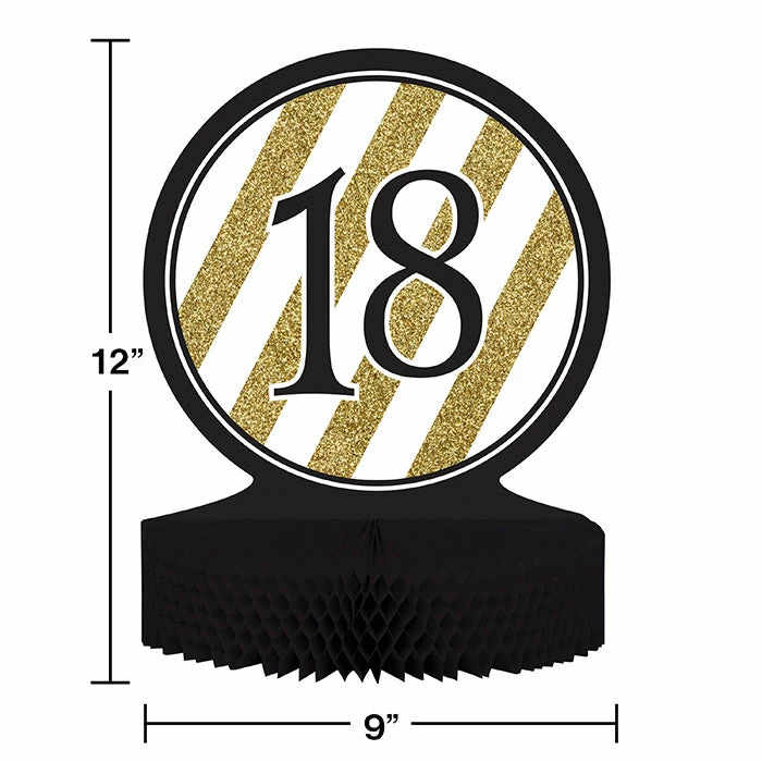 Details: Turning 18 years old is a big deal so be sure to celebrate the milestone birthday with the Black & Gold 18th Birthday Centerpiece. These dazzling party supplies feature a large cutout that displays an elegant “18” along with a gold and white striped background that sits atop a black honeycomb base. The centerpiece coordinates tremendously with other 18th birthday theme party supplies and decoration. With discount pricing, our Black and Gold 18th Birthday Centerpieces are perfect for event planners, caterers, and home hostesses alike. You get one Black And Gold 18th Birthday Centerpiece for this price. Approximate Dimensions: 9 in x 12 in