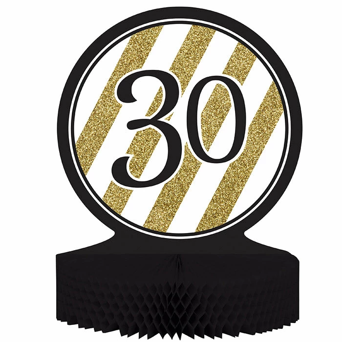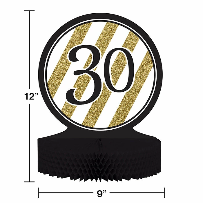 Details: Celebrate in style with the spectacular Black & Gold 30th Birthday Centerpiece. This table decoration features a large cutout that displays an elegant “30” along with a gold and white striped background that sits atop a black honeycomb base. With discount pricing, our Black and Gold 30th Birthday Centerpieces are perfect for event planners, caterers, and home hostesses alike. You get one Black And Gold 30th Birthday Centerpiece for this price. Approximate Dimensions: 9 in x 12 in