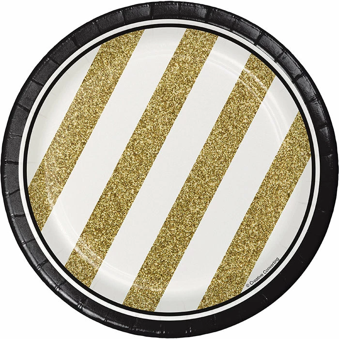 Details: Celebrate any occasion with festive party supplies ideal for any age with the Black & Gold Dessert Plates. These eye-catching 7″ plates feature a fun glittering gold and white stripe design with a black velvet border. The durable paper plates are ideal for appetizers and desserts and coordinate perfectly with other tableware from the complete Black & Gold theme. With discount pricing, our Black and Gold Dessert Plates are perfect for event planners, caterers, and home hostesses alike. For this price, you get one package containing (8) Black And Gold Dessert Plates. Approximate Dimensions: 6.875 in x 6.875 in