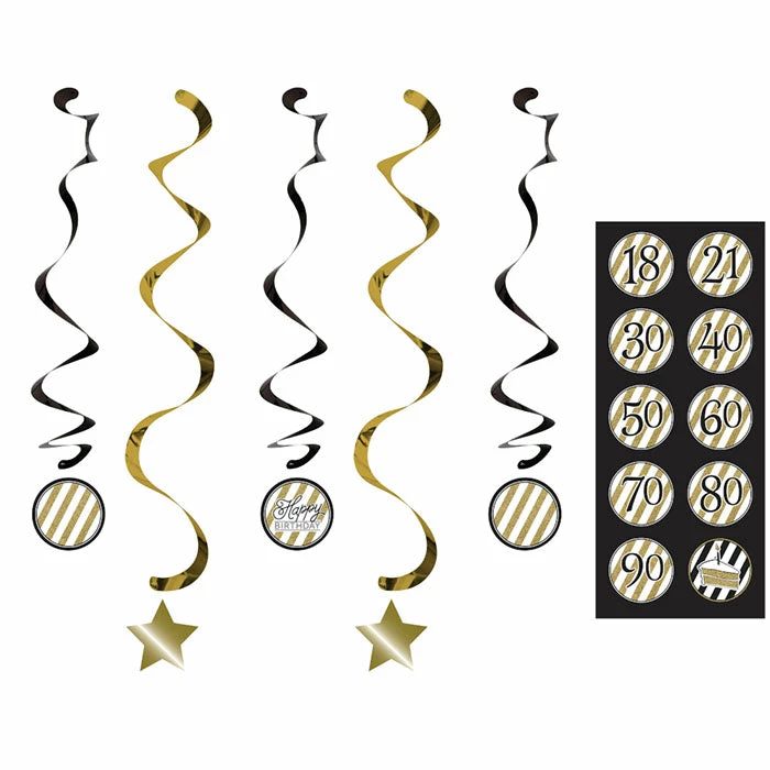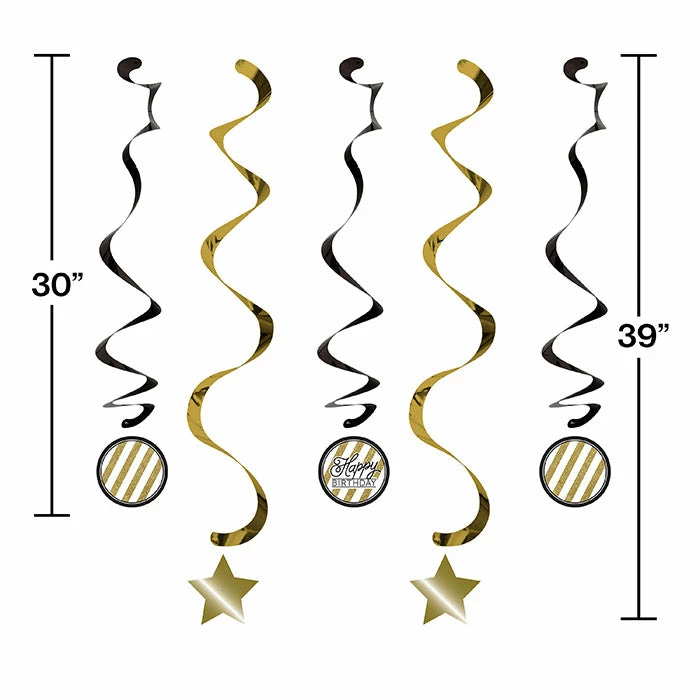 Details: Make the birthday bash the talk of the town with these Black & Gold Dizzy Danglers. Celebrate the big day by decorating the party location with these assorted hanging decorations. This party decoration contains 3 black 30″ danglers and 2 gold 39″ danglers with star cutouts and includes stickers!. With discount pricing, our Black and Gold Dizzy Danglers are perfect for event planners, caterers, and home hostesses alike. For this price, you get one package containing (5) Black And Gold Dizzy Danglers. Approximate Dimensions: 39 in