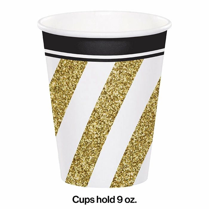 Details: The decorative Black & Gold Cups are able to handle your festive party punches in style. The durable paper cups hold 9 oz. and will make a perfect addition to birthday parties, Barbecues, and family gatherings. These party cups coordinate with other Black & Gold party supplies. With discount pricing, our Black and Gold Cups are perfect for event planners, caterers, and home hostesses alike. For this price, you get one package containing (8) Black & Gold Hot/Cold Paper Cups 9 Oz. Approximate Dimensions: 3.75 in