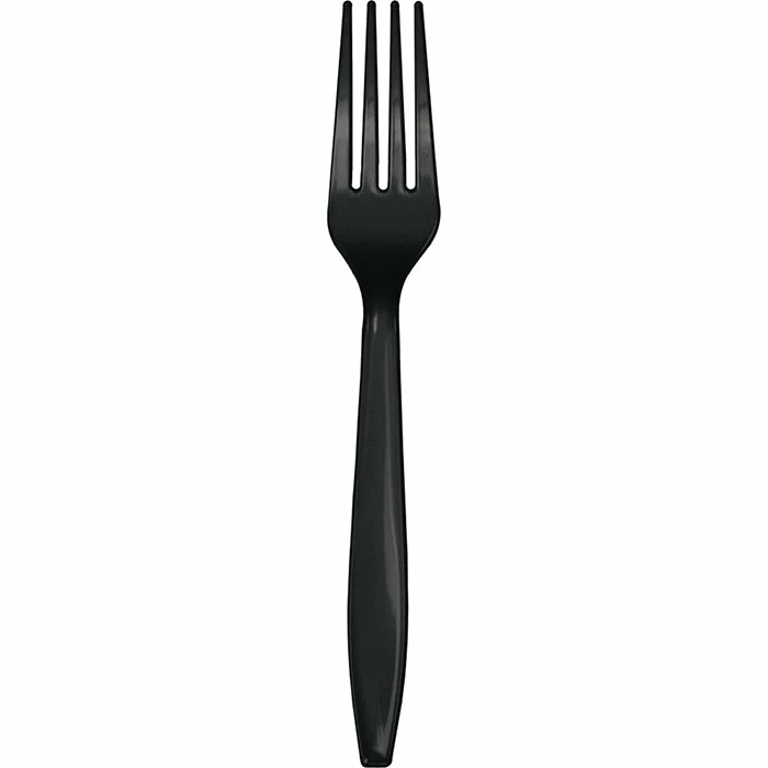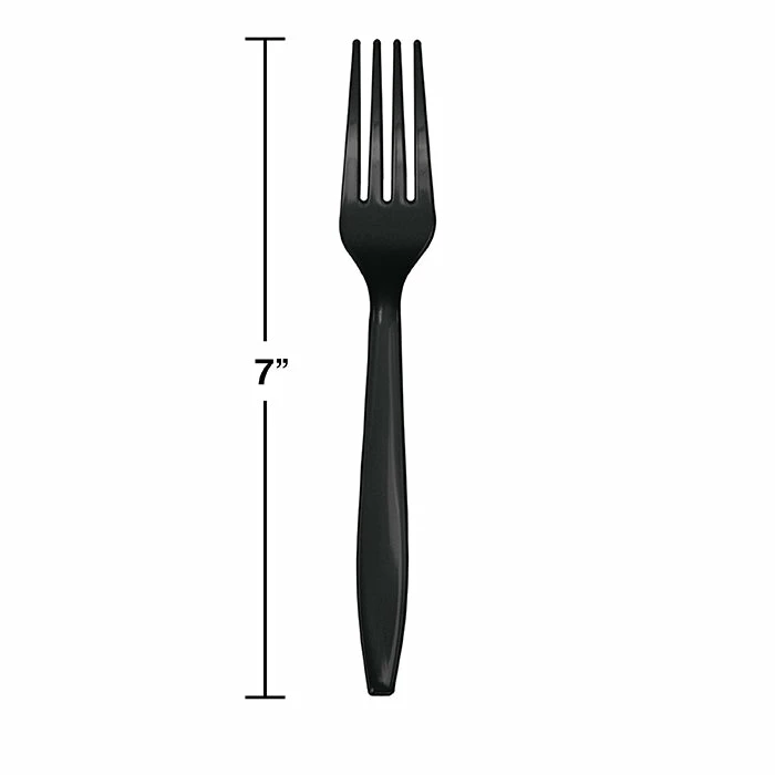 Details: Celebrate in style with our wholesale Black Velvet Plastic Forks! These black plastic forks are constructed of heavyweight plastic, so they last through an entire meal service with no worry over breakage. Stylish and sturdy, our heavy duty plastic forks are competitively priced, making them ideal for event planners, party hosts, and restaurant owners who need budget-friendly plastic forks. Plus, you won’t need to stress over post-party clean-up, because our black plastic cutlery is disposable. These black disposable forks can be simply thrown away or recycled after use. Complement the look by ordering our velvety black forks along with our other black cutlery for maximum impact. For this price, you get one package containing (24) Black Plastic Forks. Approximate Dimensions: 7 in