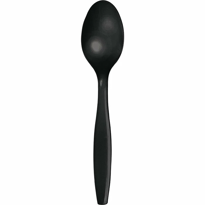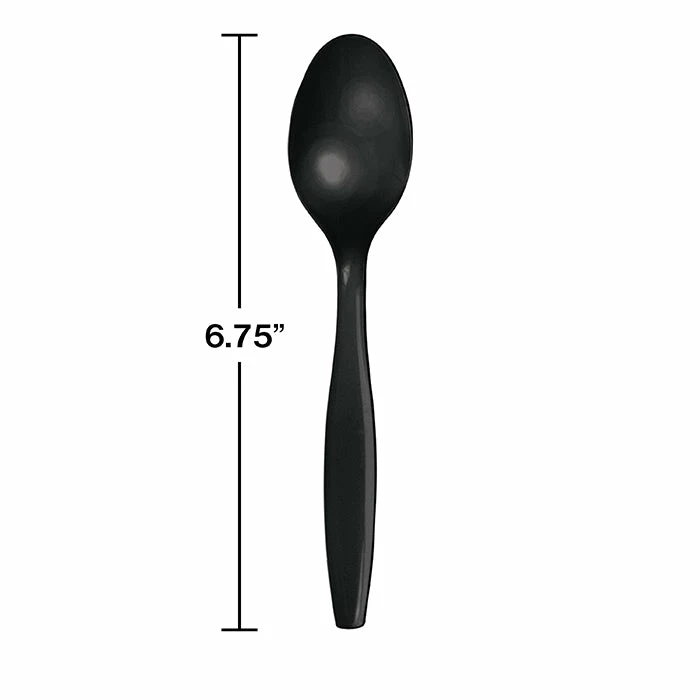 Details: Our wholesale Black Velvet Plastic Spoons are the perfect combination of style, sturdiness and convenience. These stylish, velvety black plastic spoons will make any tabletop look absolutely elegant. In addition to their stylish color, guests and patrons alike will adore the excellent quality of these disposable serving spoons; our plastic silverware is constructed from premium plastic, so they’ll last through an entire meal service without worry over breakage. Use our black velvet spoons with our entire set of black velvet cutlery, or pair these black spoons with plastic cutlery in other colors for an extra stylish look. For this price, you get one package containing (24) Black Plastic Spoons. Approximate Dimensions: 6 in