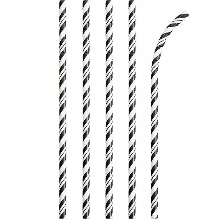 Details: Guests will be sipping pretty and having a great time when you set out the jazzy Black and White Striped Paper Straws to be used with drinks. The decorative flexible straws feature wide and narrow diagonal stripes printed on sturdy paper that is completely biodegradable and compostable. The disposable straws are made in the USA from FDA accepted materials that use food safe dyes. Each straw measures 7.75 inches and the wholesale quantities are designed to be used by restaurants, zoos, theme parks, event planners, hotels, airports and more. The drinking straws coordinate with multiple events, are entertaining to display and safe for the environment. Paper straws are sold in packages of 24. For this price, you get one package containing (24) Black Striped Paper Straws. Approximate Dimensions: 7.75 in
