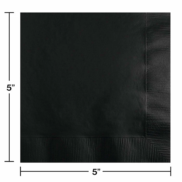 Details: The Black Velvet Beverage Napkins from our Touch of Color collection feature an unsurpassed color match consistency on every package produced. The high quality 2-ply drink napkin is quarter folded to measure 4.938 inches square and features an embossed coin edge pattern on two of the napkin edges for a classic appeal. The high count napkin package makes it perfect for hosting larger events. The Black Velvet Beverage Napkins coordinate with all the Black Velvet party supplies or can easily be paired with a themed pattern for a classy accent, retail 50 napkins per package. For this price, you get one package containing (50) Black Velvet Beverage Napkin 2Ply. Approximate Dimensions: 5 in x 5 in