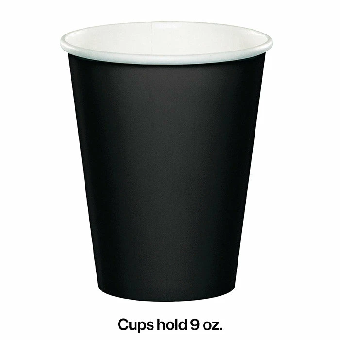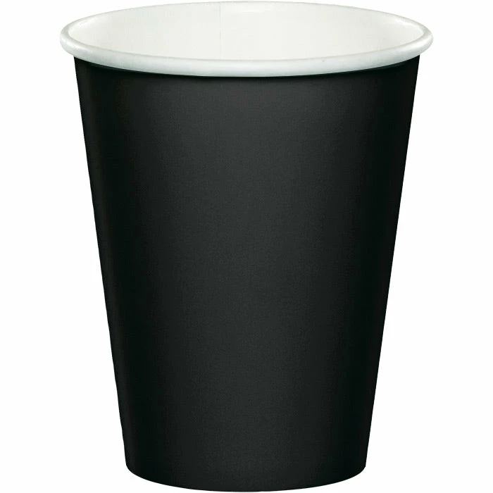 Details: The Black Velvet Hot & Cold Cups from our Touch of Color collection is an economical and easy way to host a variety of beverages at any special event. Designed to coordinate with all the Black Velvet solid color party supplies, the sturdy paper cups feature a classy midnight black color on the outside of the cup while the inside of the cup is a crisp white. Each cup holds up to 9 ounces of both hot and cold beverages, making it a great choice for hosting events that will offer a variety of beverage selections. The Black Velvet Hot & Cold Cups retails 24 cups per package. For this price, you get one package containing (24) Black Velvet Hot/Cold Paper Cups 9 Oz. Approximate Dimensions: 3.75 in