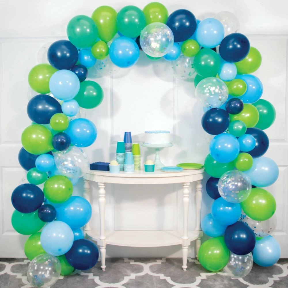 Details: Make your next special event even more special with the Blue and Green Balloon Arch Kit. Complete with 110 latex balloons in varying sizes and shades of blue and green, this balloon garland kit measures 16′ and comes with 1 plastic arch strip and 1 ribbon for hanging. Sold in packs of 112 pieces making 1 arch, it’s the perfect thing to pair with any other blue or green party supplies. Hang it above your tables or a doorway to create a joyful ambiance for a birthday party, wedding, anniversary, or more. Our Blue and Green Sixteen Foot Balloon Arch Kit is perfect for event planners, caterers, and home hostesses alike.