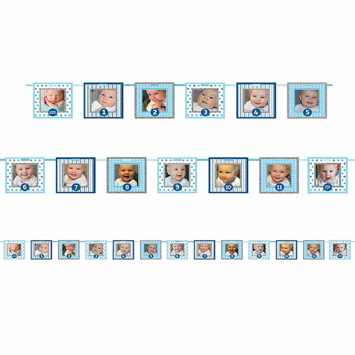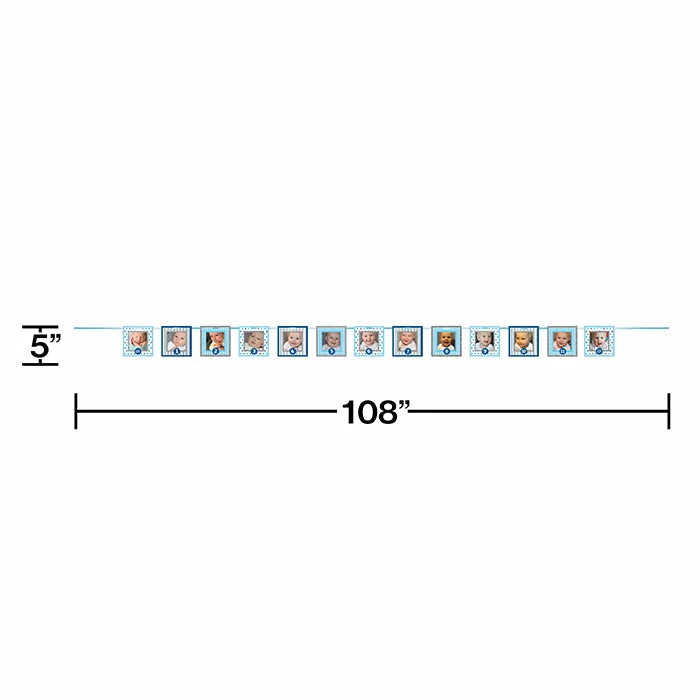 Provide a personal and customized touch to the birthday scene with this 1st Birthday Boy Photo Banner. This amazing banner features an array of blue custom photo frames and provides 13 different frames to include pictures of the special birthday boy. These photo banners are an excellent addition to first birthday parties. With wholesale pricing and bulk quantities, our 1st Birthday Boy Photo Banners 12 ct are perfect for event planners, caterers, and home hostesses alike.