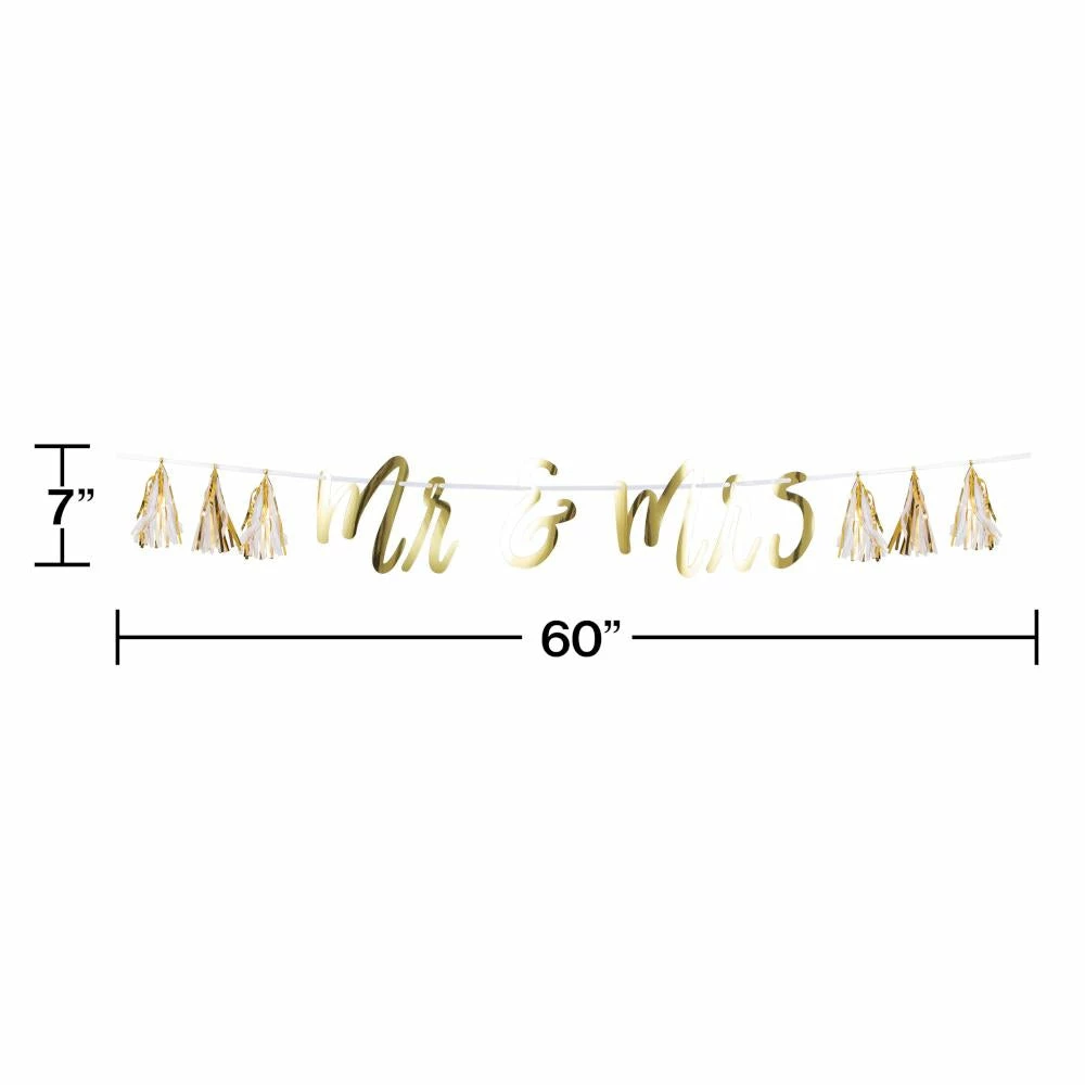 - Banner features gold “Mr and Mrs” script lettering and stylish tassels