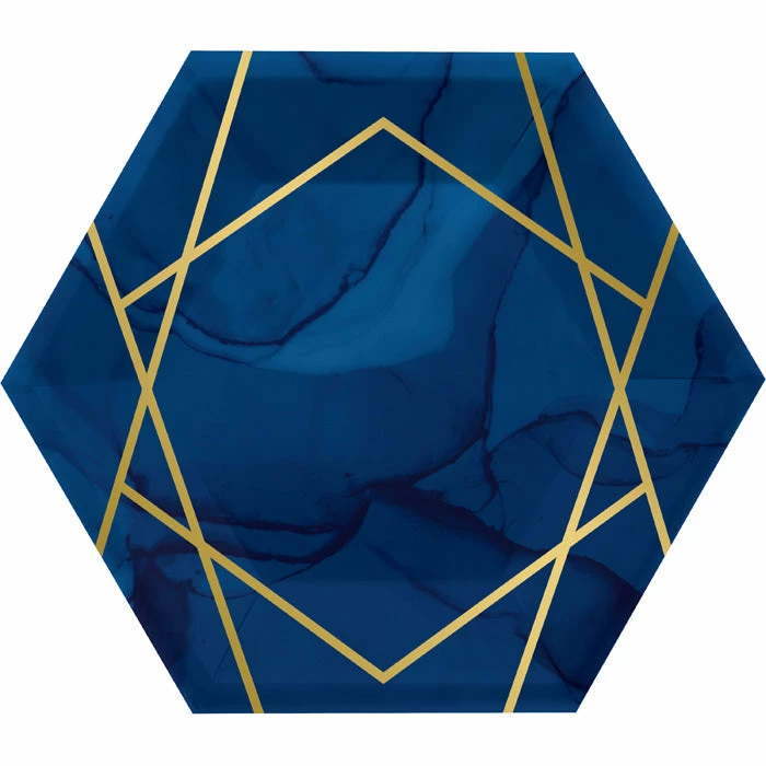 Details: Bring out the dessert on these Navy Blue and Gold Foil Dessert Plates. Featuring an elegant navy blue color with gold geometric designs, these plates are the perfect addition to any celebration. Measuring 8″ these plates can be paired with any other Navy Blue and Gold Foil party supplies. Our Navy Blue and Gold Foil Dessert Plates are perfect for event planners, caterers, and home hostesses alike.