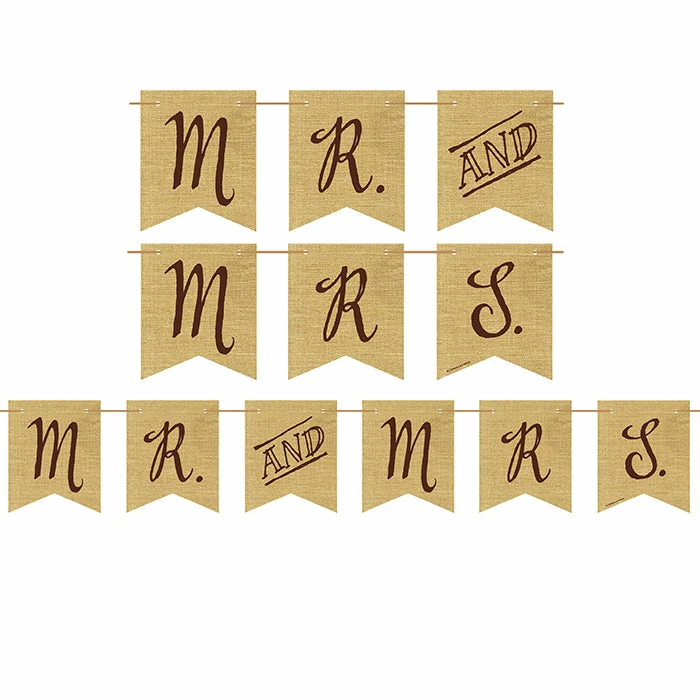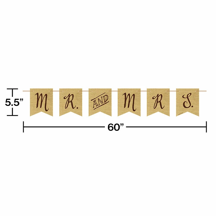 Burlap and lace is one of the hottest bridal trends going so be sure to liven up the event space with wholesale Rustic Wedding Burlap Banners. Each burlap and twine pennant banner features a ”r. and Mrs.” message spelled out on the individual flags. Combine the bulk pennant banner with other county chic selections found in our complete Rustic Wedding ensemble.