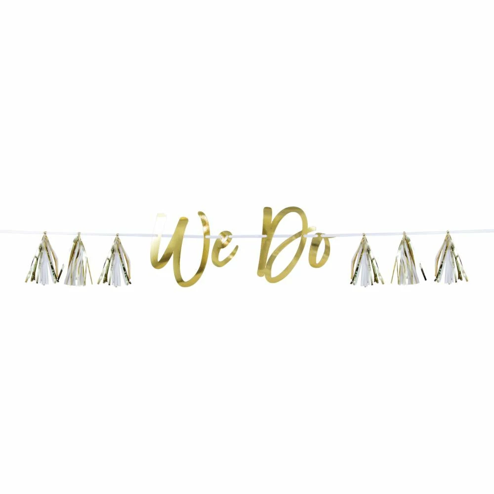 Details: Our We Do White and Gold Tassel Banner is perfect for adding a festive, stylish touch to your celebration. This banner measures 60 inches long and seven inches tall, ideal for hanging above a cake table or gift table. It features “We Do” letting that’s metallic gold and in an elegant script. On both sides of the lettering are three stylish white and gold paper tassels. This banner is perfect for engagement parties, bridal events, and weddings. Our We Do White and Gold Tassel Banner is sold one banner per package. Save more on party decorations, party favors and party supplies at PartyDecorations.com!. Material: Paper/Polyester. Approximate Size/Dimensions (inches): 7 x 60.