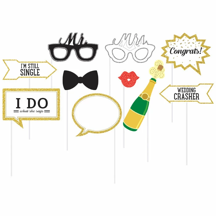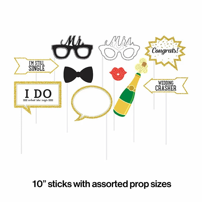 Details: Add some fun and creativity to photos at the wedding that will have you laughing as you look back on the event with the Wedding Photo Booth Props. The props include amusing items such as a speech bubble, champagne bottle, and lips. The Photo Booth Props feature sparkling glitter and will help you to create memories that will last a lifetime. With discount pricing, our Wedding Photo Booth Props are perfect for event planners, caterers, and home hostesses alike. For this price, you get one package containing (10) Wedding Photo Booth Props. Approximate Dimensions: 9 in x 15 in