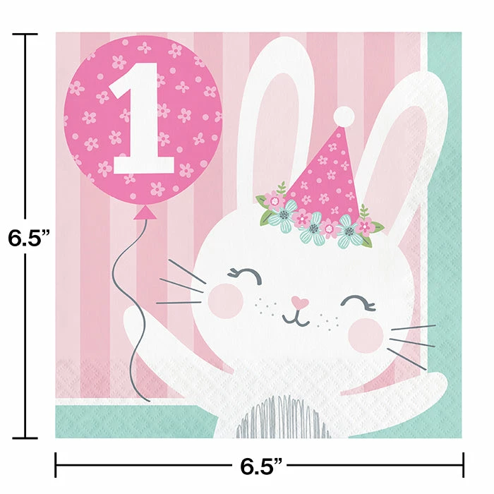 Details: Celebrate the momentous occasion with the Bunny Party 1st Birthday Napkins. These napkins measure 6.5″ and display a background of pink vertical stripes and a light blue border. In the center is a smiling bunny wearing a party hat and flowers on her head, with her arms outstretched and holding a pink balloon with a large “1” on it. These disposable napkins can be coordinated with our other Bunny Party party supplies. With discount pricing, our Bunny Party 1st Birthday Luncheon Napkins are perfect for event planners, caterers, and home hostesses alike. For this price, you get one package containing (16) Bunny Party 1st Birthday Napkins. Approximate Dimensions: 6.4 in x 6.4 in