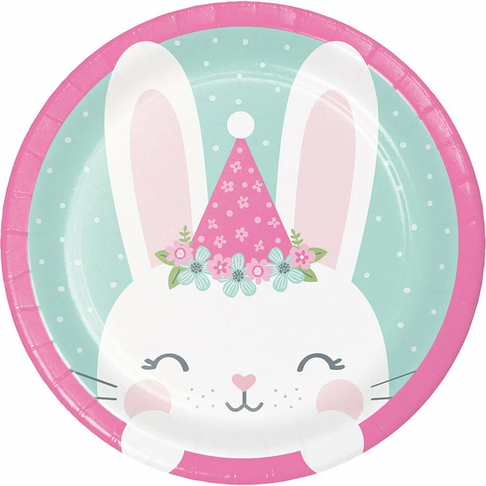 Details: These Bunny Party Dessert Plates take cuteness to another level. The Sturdy Style plates are made of paper and measure 7″ round. Each plate features a light blue background, white dots, and a dark pink border. In the center is a smiling bunny with her head in her hands and wearing a party hat and flowers. The premium strength paper plate can be combined with other Bunny Party party supplies for birthday parties and other celebrations. With discount pricing, our Bunny Party Dessert Plates are perfect for event planners, caterers, and home hostesses alike. For this price, you get one package containing (8) Bunny Party Dessert Plates. Approximate Dimensions: 6.875 in x 6.875 in